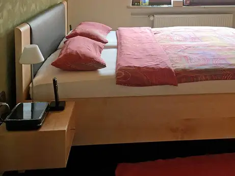 Das Ahornbett mit Lederrücklehne hat breite Zargen für die elektrischen Komfortrahmen. Dazu angehängte Nachtkästchen.