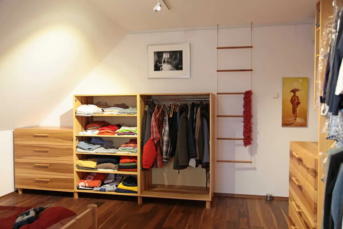 Natürlich kann man hier keinen normalen Schrank bauen, es sollte schon was Besonderes sein, das einerseits für den kleinen Raum, in dem es landet, nicht zu erdrückend wird, andererseits natürlich genügend Stauraum für Klamotten bietet.