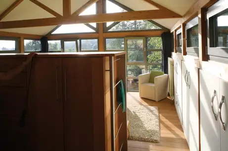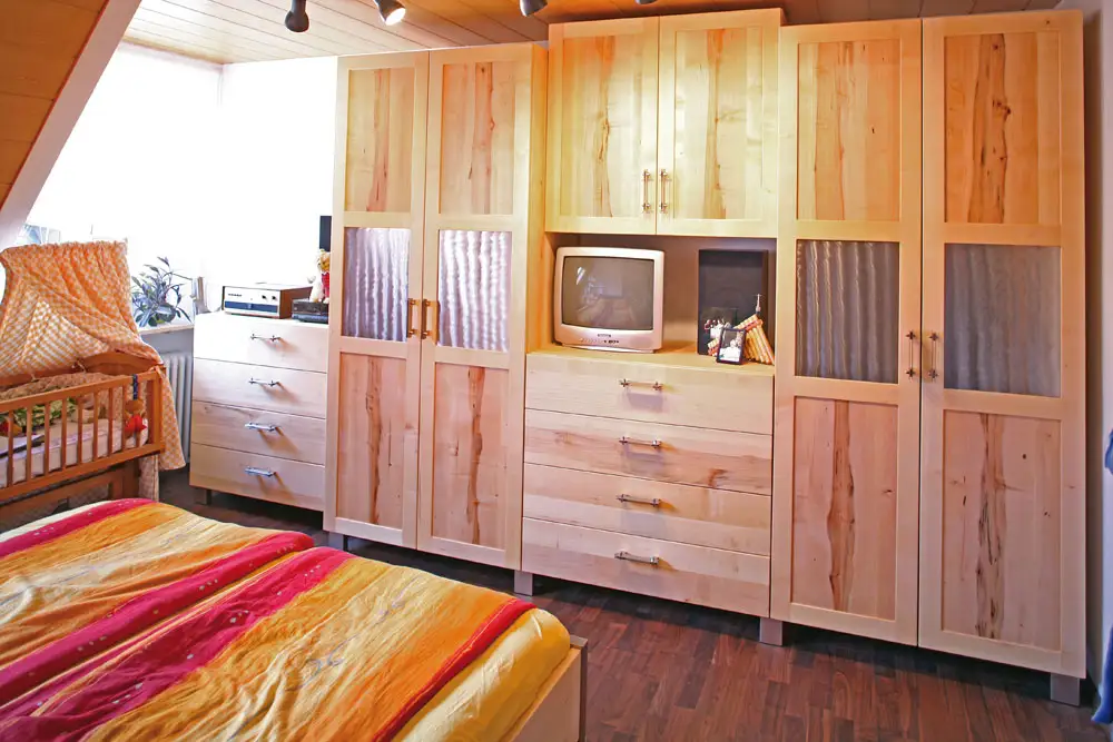 Familie Holzinger hat Schubladen und Türen mit weiß pulverbeschichtetem Glas und natürlich van Anfang an ein Möbelmacher-Schlafzimmer aus Buche mit einer halbhohen Schrankzeile am Betthaupt.