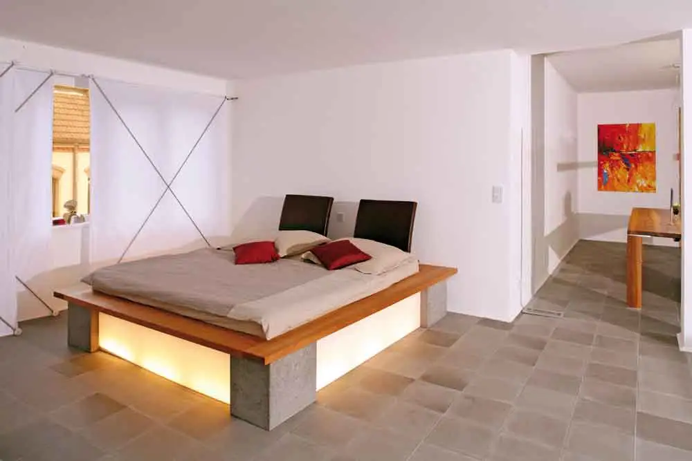 Das Bett im Loft von Nicole Obert ist beleuchtet. Kirschbaum, Stein und braunes, pflanzlich gegerbtes Leder, wo man das Wort "geil" glatt in seiner Ursprungsbedeutung anwenden könnte.