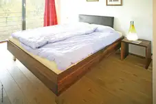Das Nussbaumbett selbst ist kaum noch leichter machbar. Eine umlaufende Zarge, vier Edelstahlbeine und eine Lederlehne werden von zwei Nachtkästchen in U-Form ergänzt.