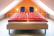 Schlichtes Buchenbett mit Lederrücklehnen in Dachschrägenoptik, das Bettsystem kommt von Pro Natura.