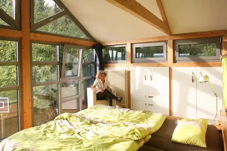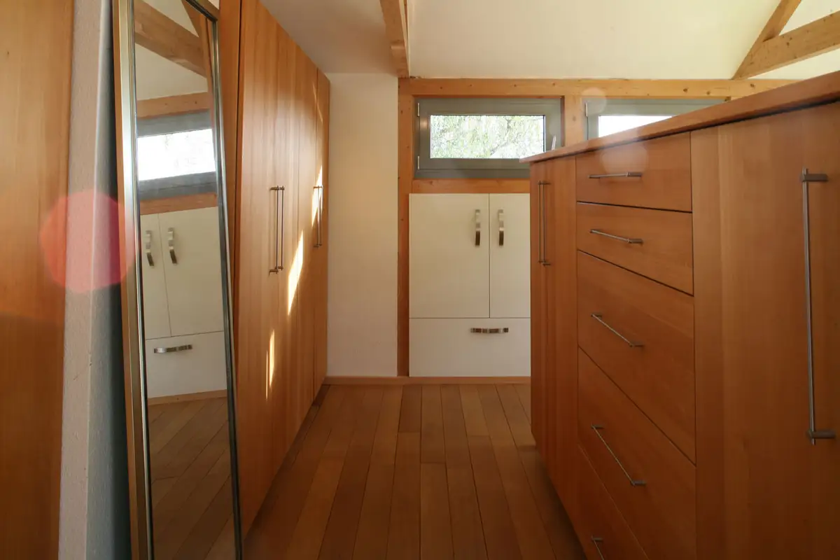 Das ökologische Holzhaus der Familie Holzinger (Architekturbüro Atelier 13) hat eine traumhafte Aussicht und den Dachraum im Schlafzimmer bisher noch nicht genutzt. Aber irgendwann ist es genug Holz und so haben wir die Einbauten in den Dachraum mit weißen Glasfronten verblendet.