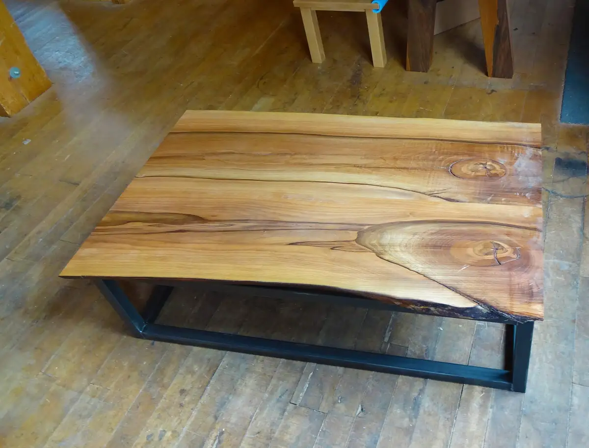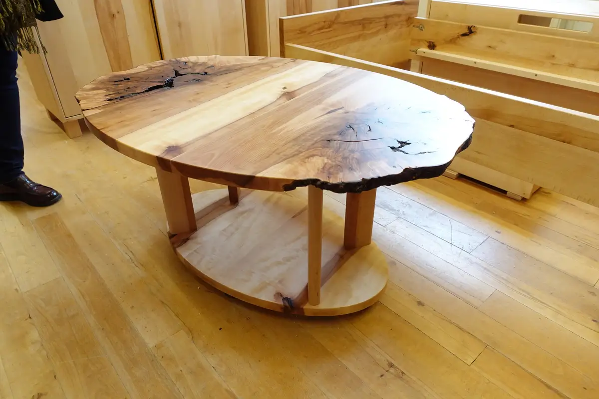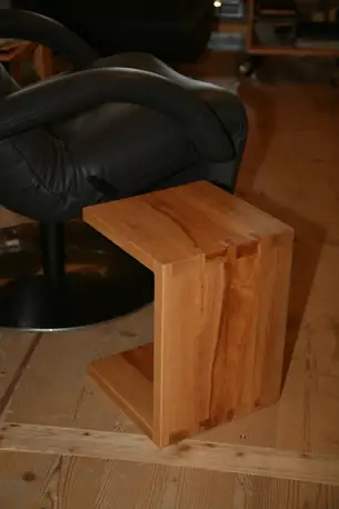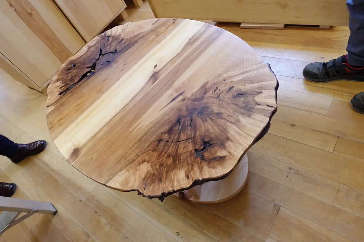 Eine absolute Besonderheit ist dieser Couchtisch aus Elsbeere, deren Stamm eine Knolle ausgebildet hatte, die wir nach dem Sägen sorgfältig pflegten, sodass wir jetzt einen ansehnliche Rolltisch draus machen konnten. Einige Besonderheiten schlummern in unserem Holzlager, man muss uns nur drauf ansprechen.
