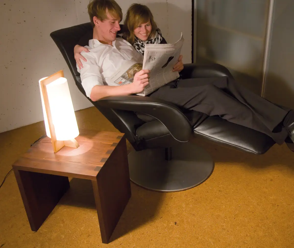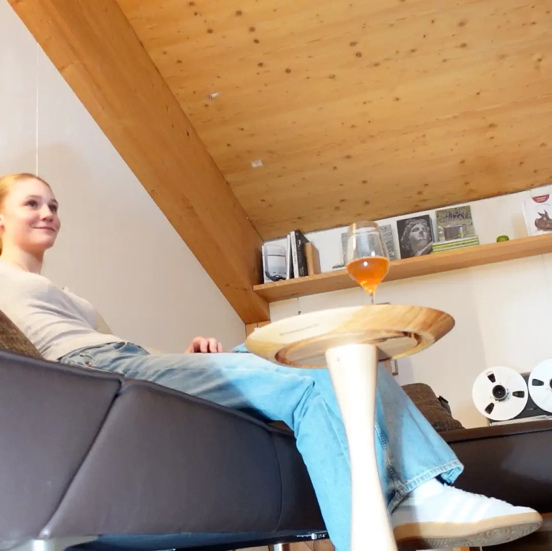 Joels Verwöhnprogramm für Linda mit Relaxsessel Symphony und höhenverstellbarem Couchtisch im Kirschbaum Massivholz