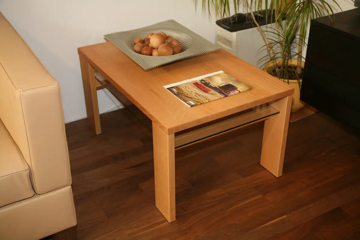 Einfacher Buchen-Couchtisch mit stirnseitig sichtbaren Beinen