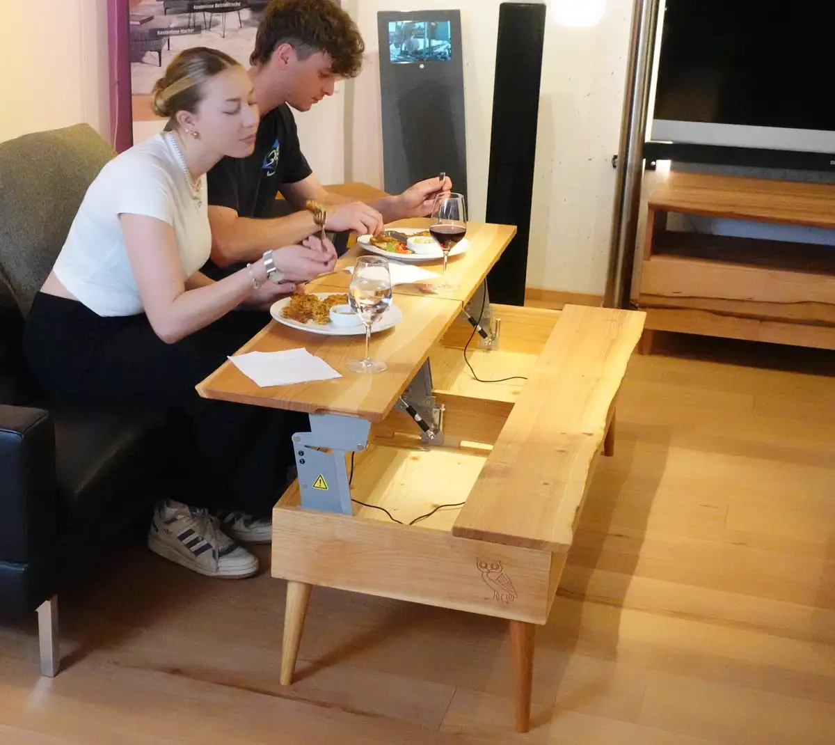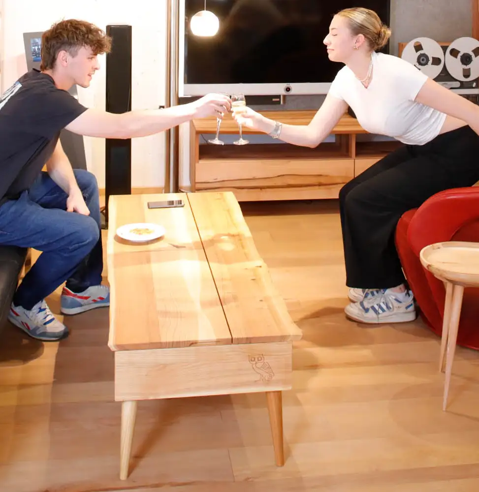 Natürlich kann man darüber diskutieren, ob man am Couchtisch essen sollte, aber es gibt auch Wohnungen ohne eigenen Essplatz und man kann daran auch sehr bequem am Notebook arbeiten. Davon abgesehen geben unsere Kunden an, welche Ausstattung ihr Möbel haben soll und für diese junge Dame sollte der Sofatisch eben höhenverstellbar sein und Smartphones aufladen können.