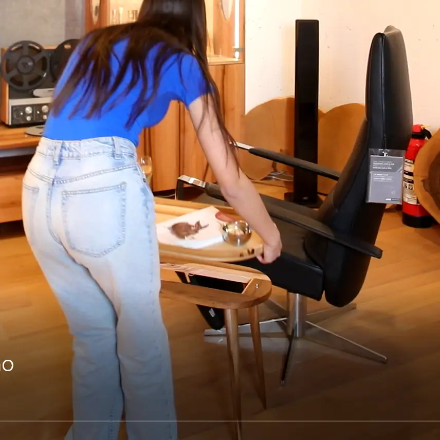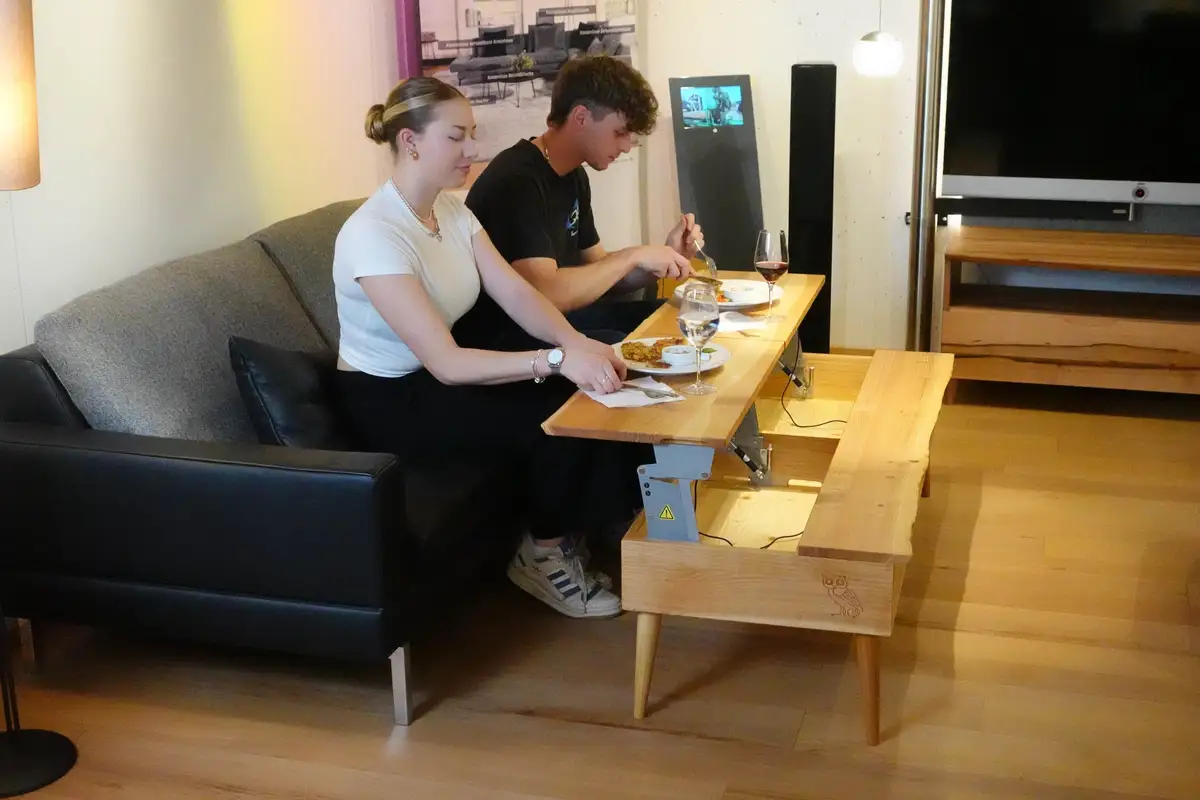 Gentleman Joel (unser Auszubildender) empfängt Freundin Linda, nimmt ihr Tasche und Jacke ab und serviert zunächst mal den Aperitif aus selbst gemachten Chips und Secco. Später kommt noch das Sellerieschnitzel mit Baggers und grüner Pffeffersauce auf den hochfahrbaren Couchtisch, das Tonband säuselt stimmungsvolle Musik und natürlich räumt er auch auf, während Linda wieder im Symphony von JORI Platz nimmt. Und dann legt er Lindas Smartphone noch genau dort auf den Couchtisch, wo es auch induktiv aufgeladen wird.