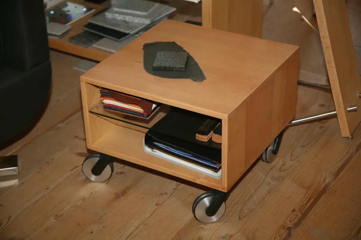 Geschwungene Ablageplatte aus Kirschbaum auf rollbaren Massivholzcontainer: ebenfalls eine schöne Dekomöglichkeit