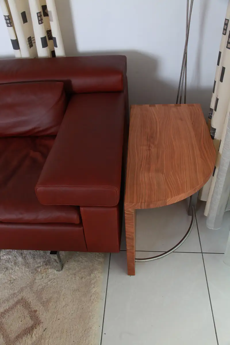 Auch neben dem Sofa steht ein solcher Sofatisch in Kirschbaum mit Edelstahl