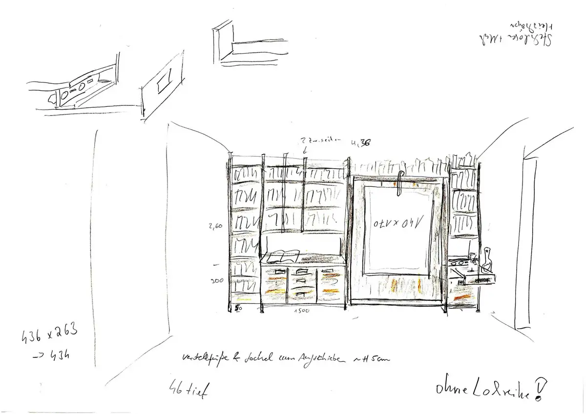 - Beim gemeinsamen Planen entwickelten wir eine Idee, wie die seitlich einsehbaren Kabel hinter der TV und Hifi-Anlage versteckt werden können: mit einem schwarzen pulverbeschichtetem Blech, das überhaupt nicht auffällt.