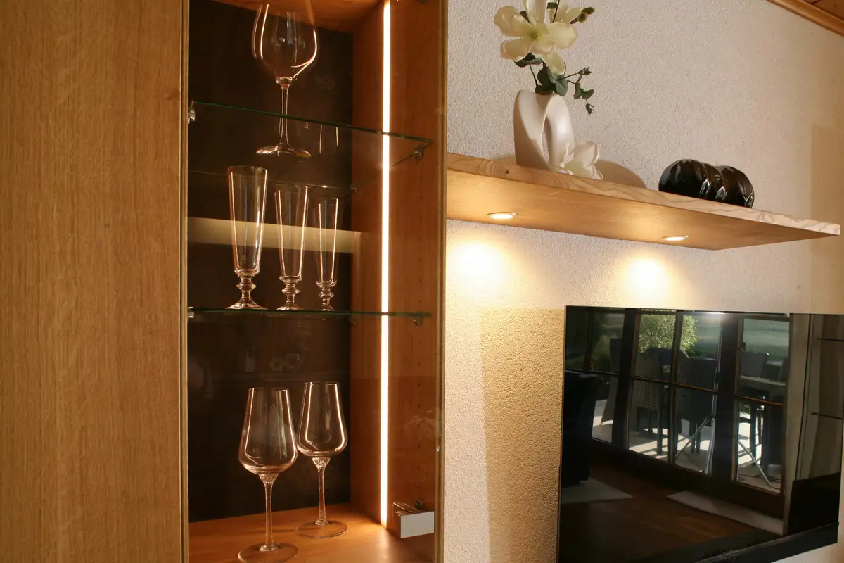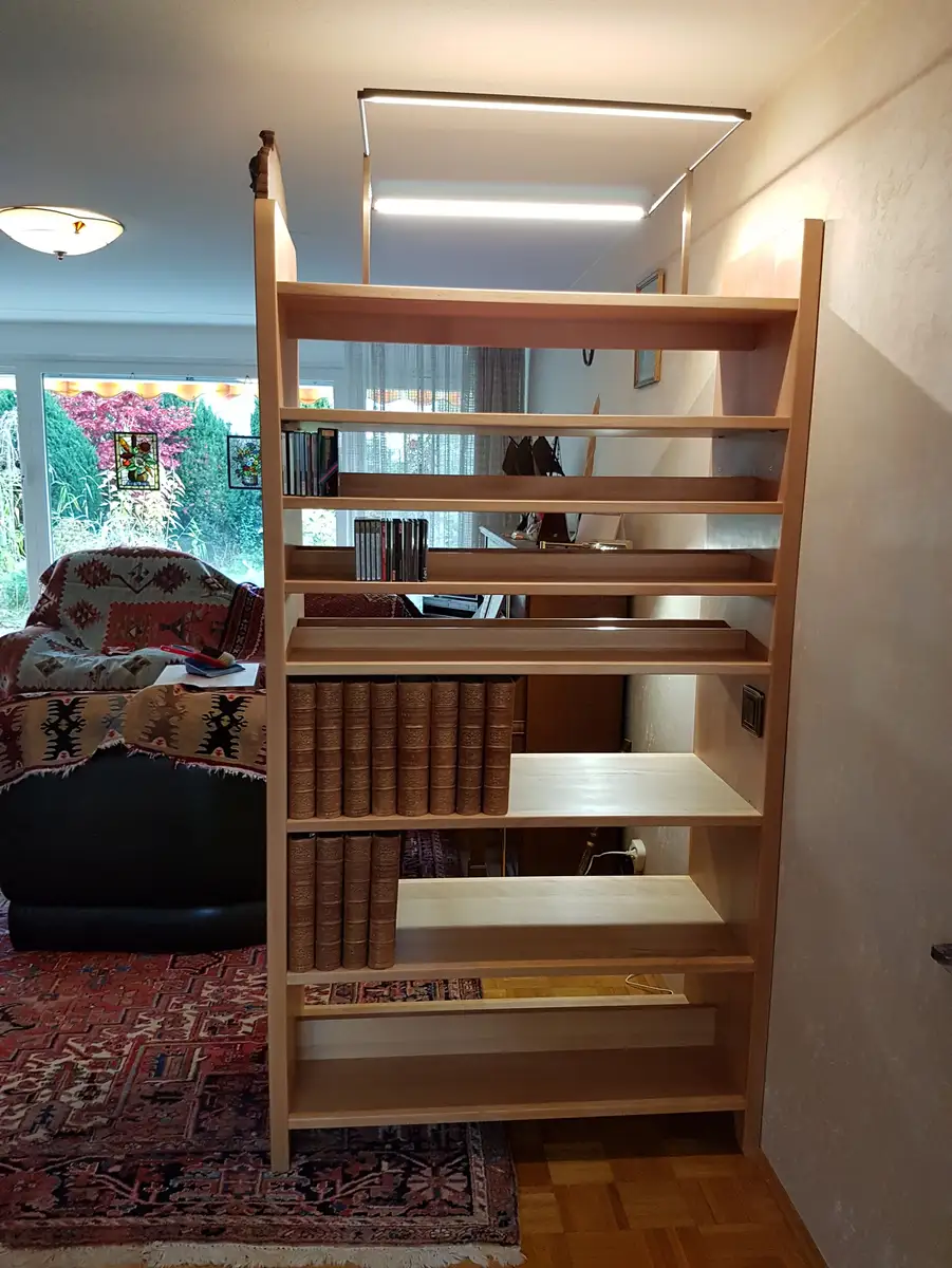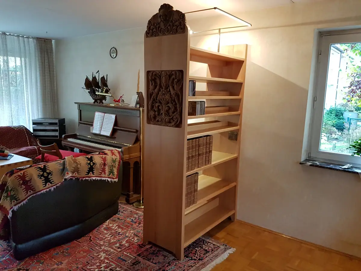 Von seinem Großvater hatte Manfred Lautenschlager noch die emotional wertvollen Schnitzereien, die wir in einen Raumteiler integrierten. Das beidseitige Bücher- und CD-Regal bekam noch eine Spezialbeleuchtung, die für uns die Firma betec anfertigte und ziert seitdem das Wohnzimmer, in der Zwischenzeit ist natürlich kein Platz mehr frei im Regal.