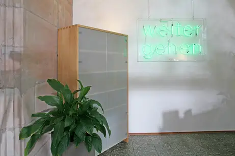 - Als kleinen Hingucker haben wir eine Schublade im Lowboard und die Rückwand in der Vitrine aus gesinterter Keramik gefertigt.