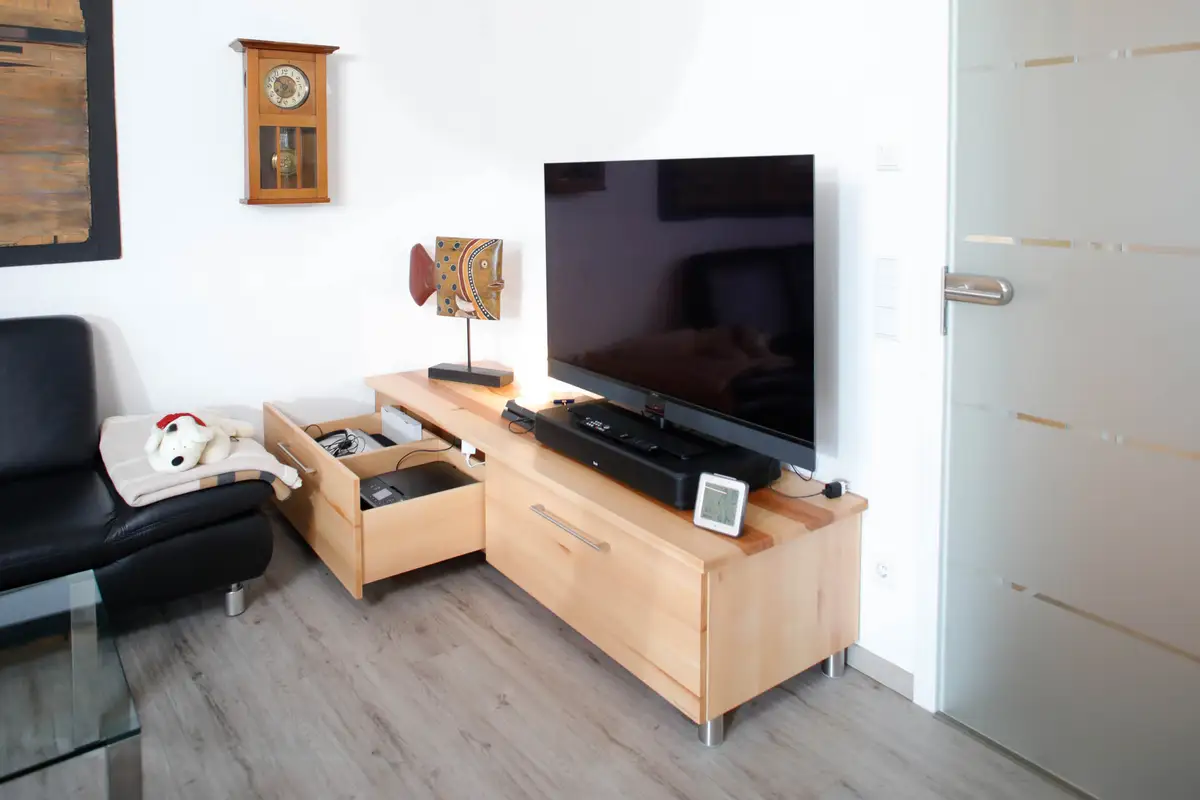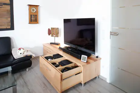 Im Low-Board für den Fernseher wurde die Einrichtung ebenfalls sehr sorgfältig auf die persönlichen Bedürfnisse abgestimmt. So ist in der hinteren Schublade zum Beispiel der Familiendrucker untergebracht, weil er dort am wenigsten stört und nach dem Öffnen der Schublade supergut zu bedienen ist. Ausgedruckt kann von allen Geräten im Haus werden, nur abholen muss man sich das Schreiben oder Foto dann halt.