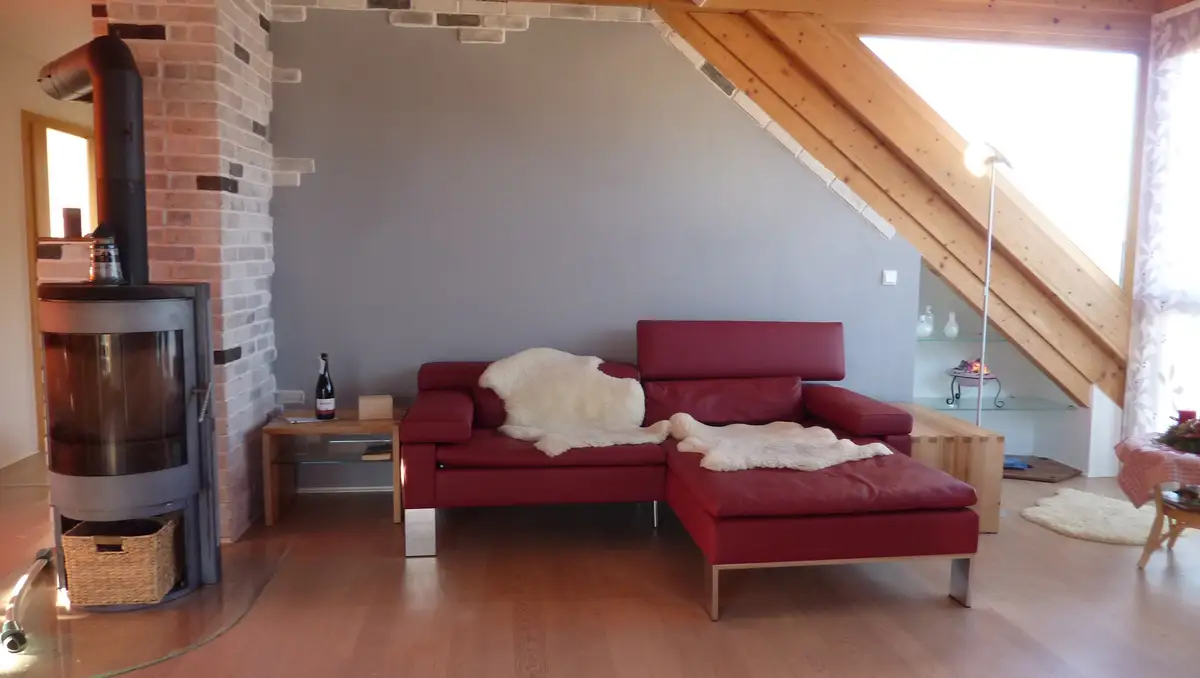 In Ottensoos steh diese Kombination aus Buchenmassivholz mit rotem Leder. Das Sofa von Jori heißt Shiva, die Jori-Stühle am Essplatz Oscarini und der Fernseher ist an einer raffinierten, rot lackierten Mechanik aufgehängt, die ihn auch zum Essplatz hin schwenkbar macht.