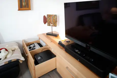 - Das Auszugstablar über der mittleren Schublade trägt alle Fernbedienungen.