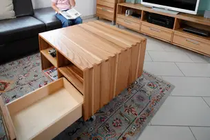 Der Couchtisch wurde wie die Vitrine auf Gehrung verleimt und hat natürlich eine durchlaufende Maserung und zwei Schubladen