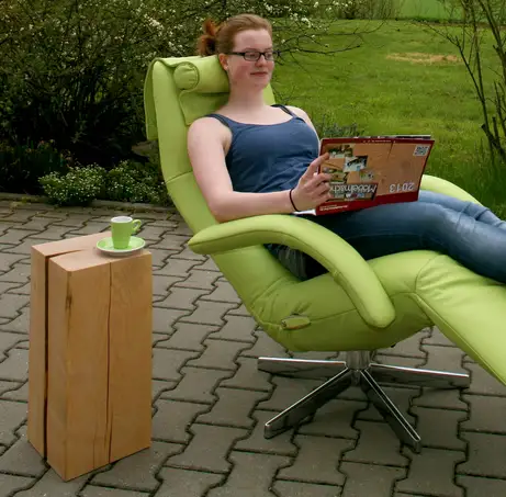 Elsbeerenmöbel mit Marlene und Jule, der Stehleuchte von Oligo und dem Relaxsessel von Jori