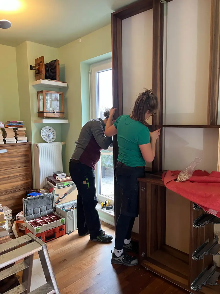 Ein Aufzug ins Penthouse ist sehr hilfreich, leider passen viele große Möbelteile nicht hinein. Die Bettfront musste sogar nochmal auseinandergenommen werden, um überhaupt durchs Treppenhaus zu passen. Der Kunde selbst hat unermüdlich mitgearbeitet, seine Montagestunden wurden festgehalten, aber nicht berechnet, hihi.