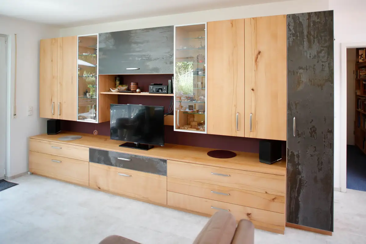 Schrankwand in Buche Massivholz mit Keramik in Alu-Rahmen