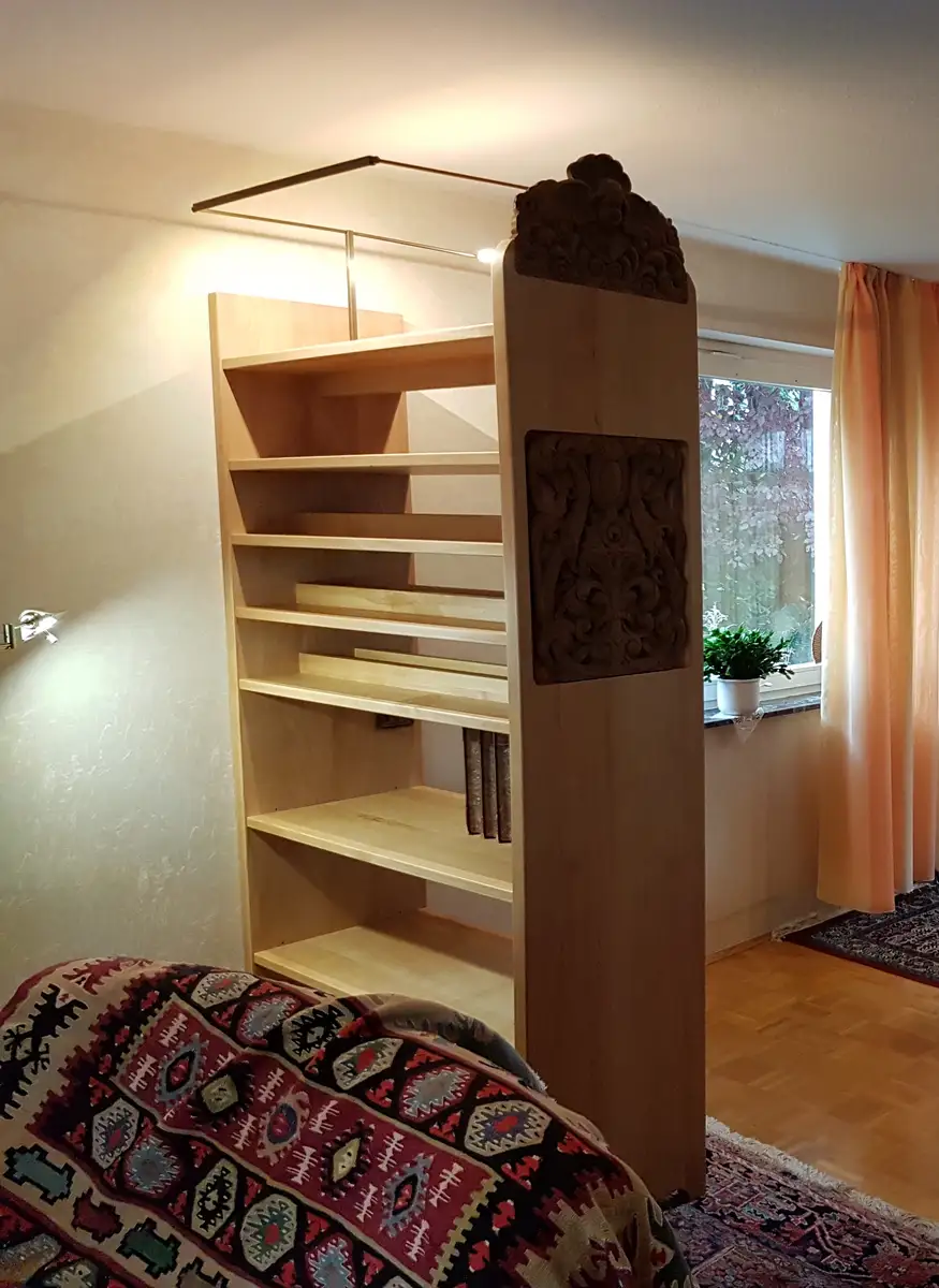 Raumteiler als beidseitiges Bücher und CD-Regal mit antiken Applikationen