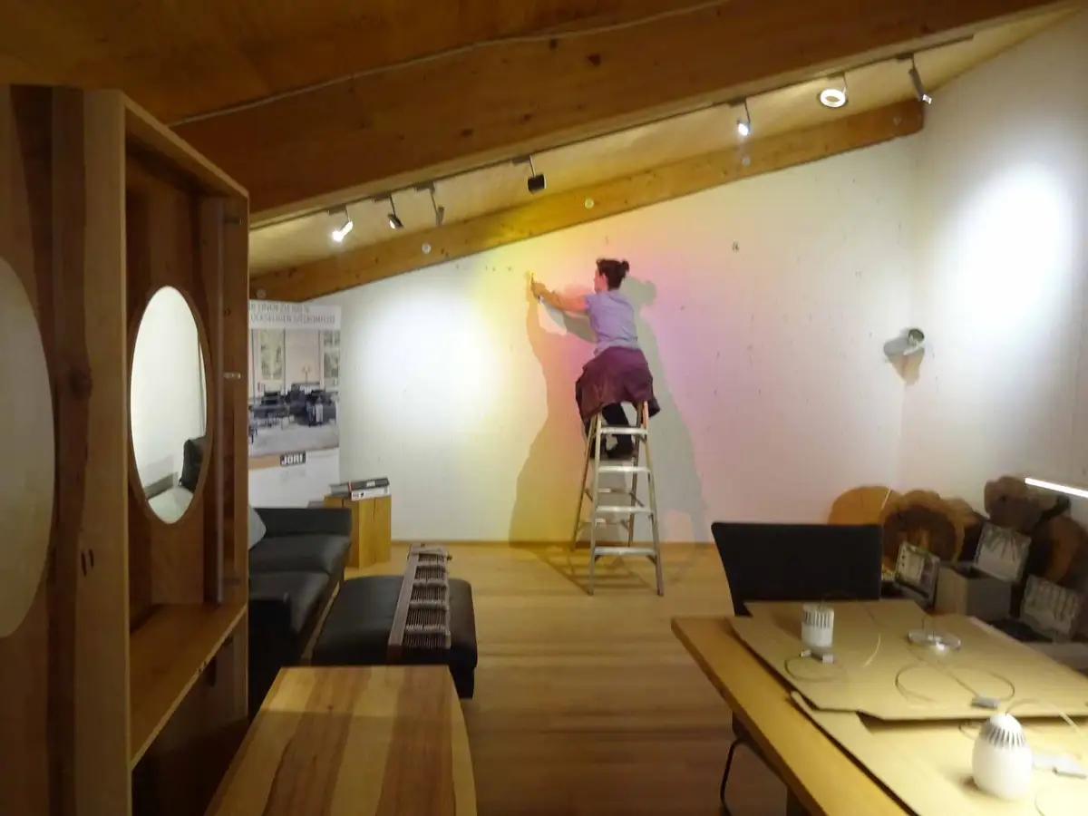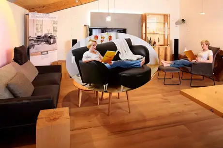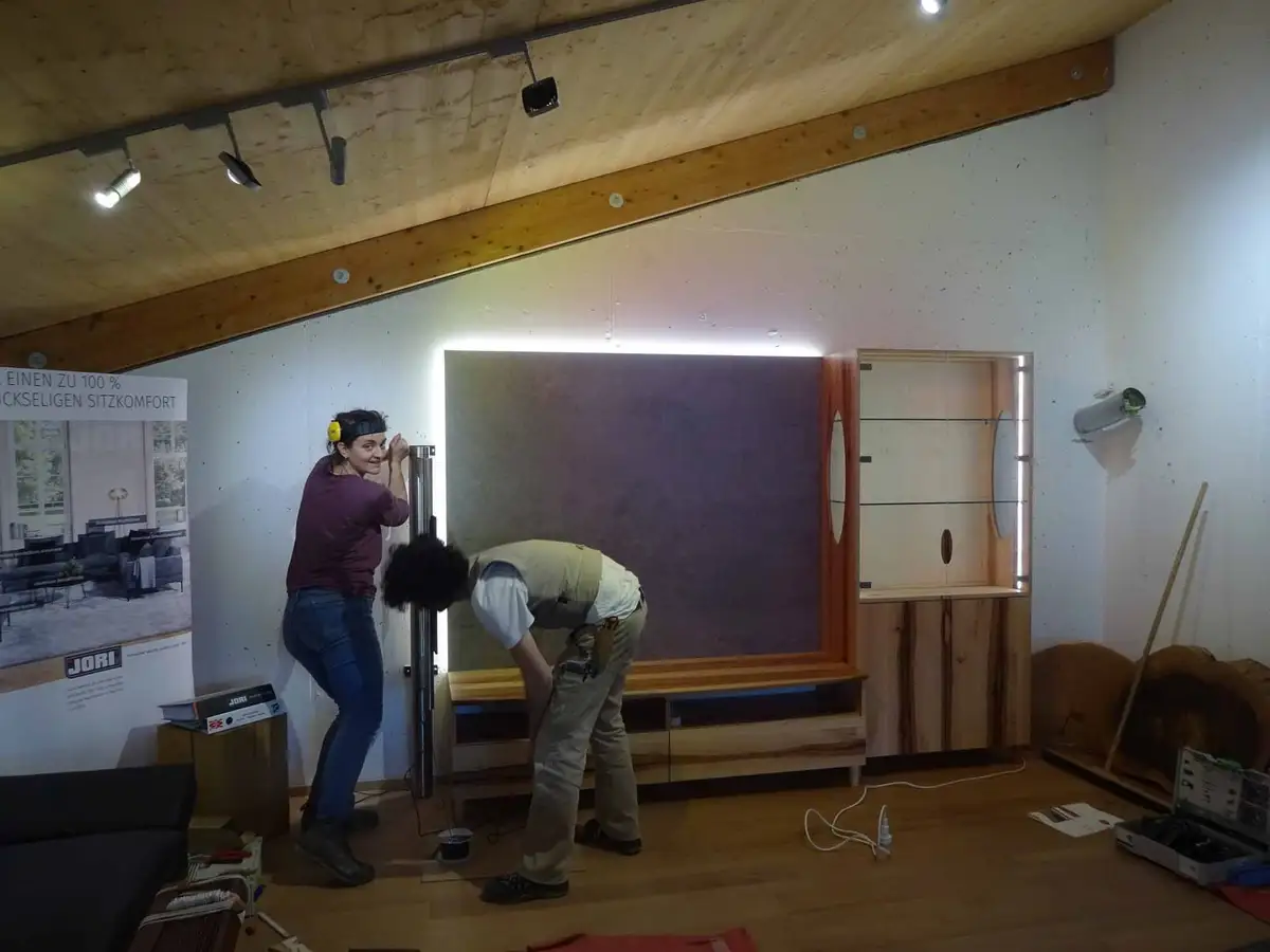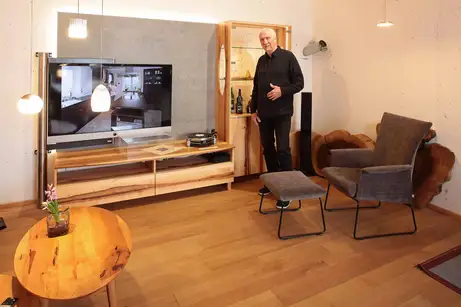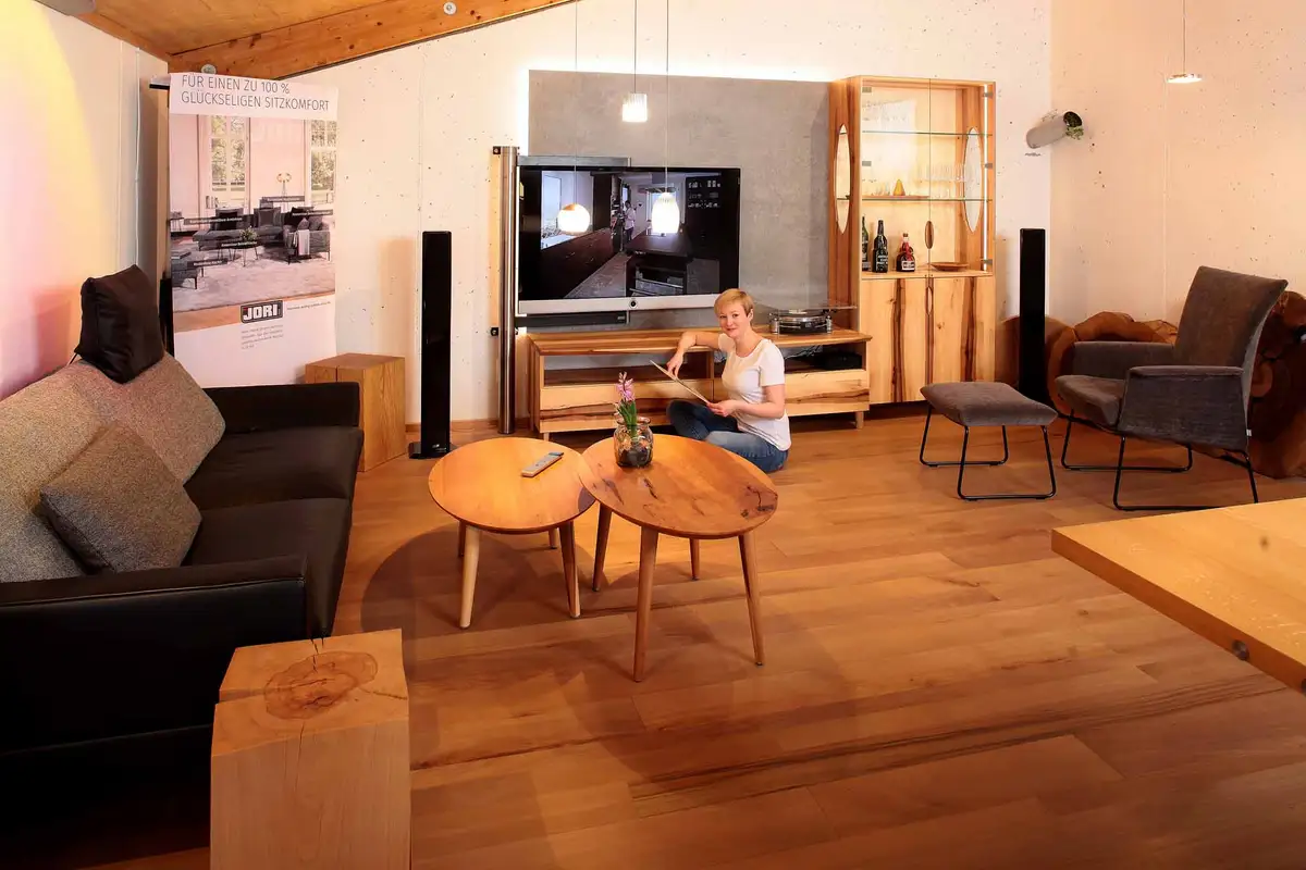 Dieses Wohnzimmer aus fränkischer Elsbeere ziert seit Ende März - ausgerechnet der Beginn der Ausgangsbeschränkungen - unsere Ausstellung