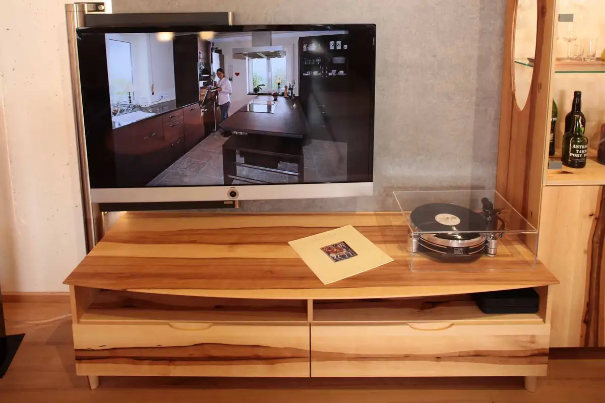 Der Hintergrund zum Fernseher, der digitalen Hifianlage und dem Plattenspieler