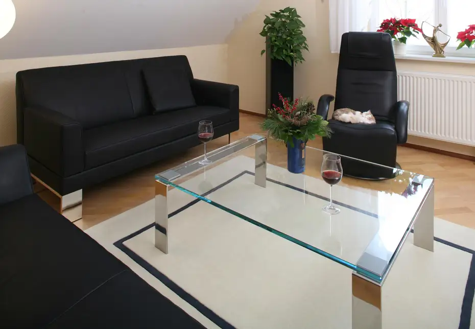 Das Gestell unseres Couchtisches ist aus poliertem Edelstahl, die Platte aus Weißglas