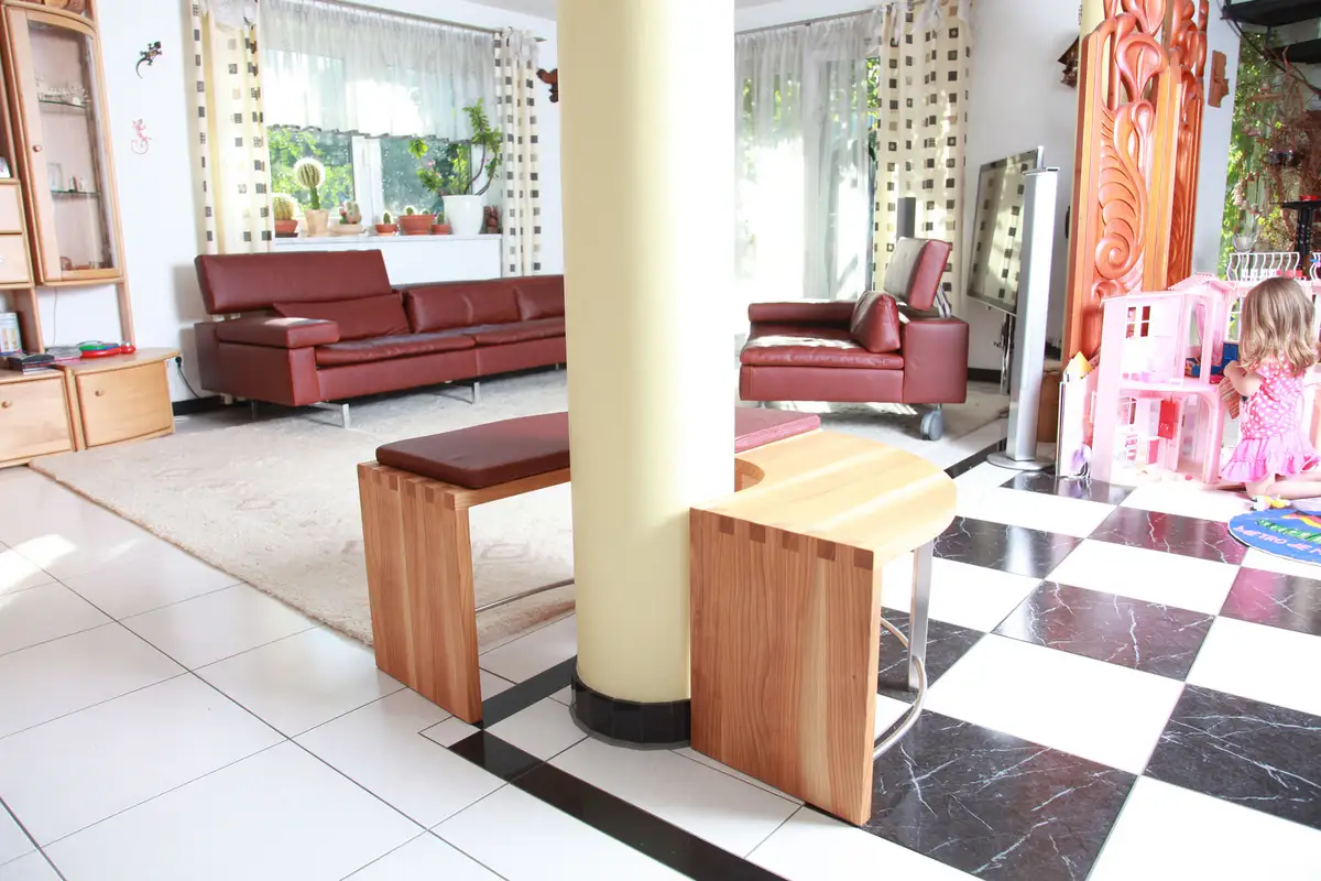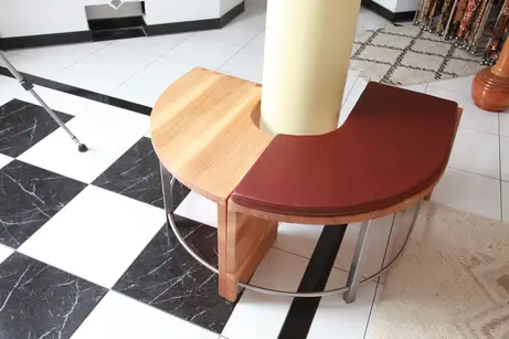 dem Ecopell bezogen. Um die Säuelen herum, oder freistehend, haben wir aus fränkischem Kirschbaum Beistelltische oder -bänke gebaut, die zusätzlich von einem Edelstahlfuß gestützt werden.